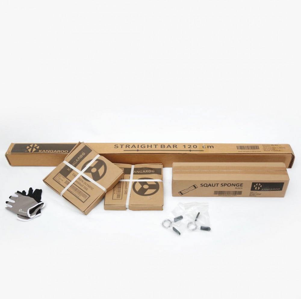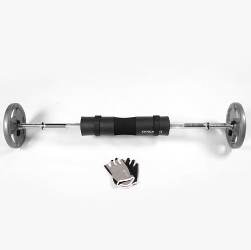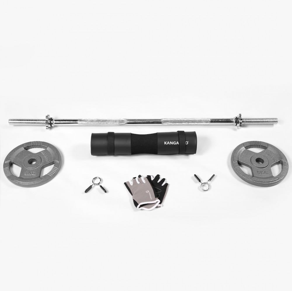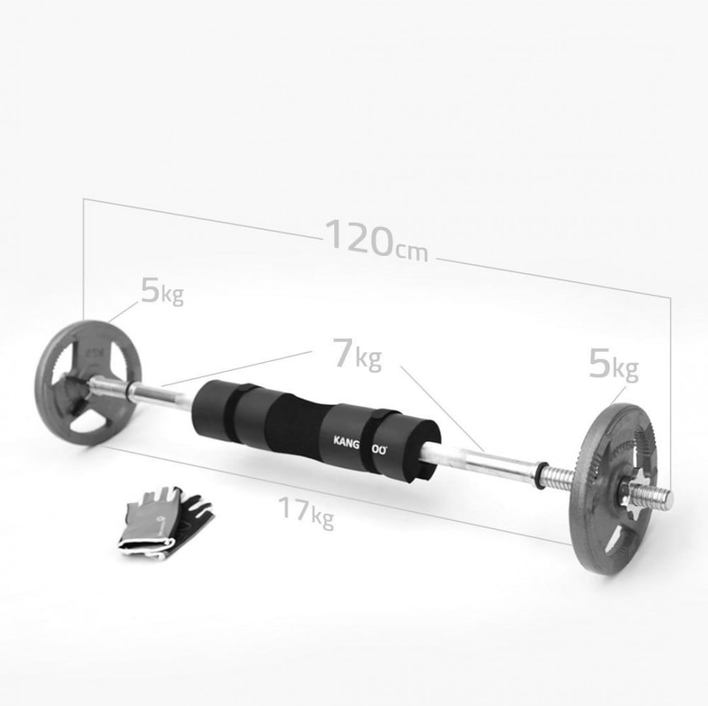 طقم أوزان كانجرو قابل للتعديل بوزن 17 كجم: بار مستقيم بطول 120 سم، لوحين 5 كجم، مشبكان، بار إسفنجي، وقفاز كانجرو للتدريب المتنوع.