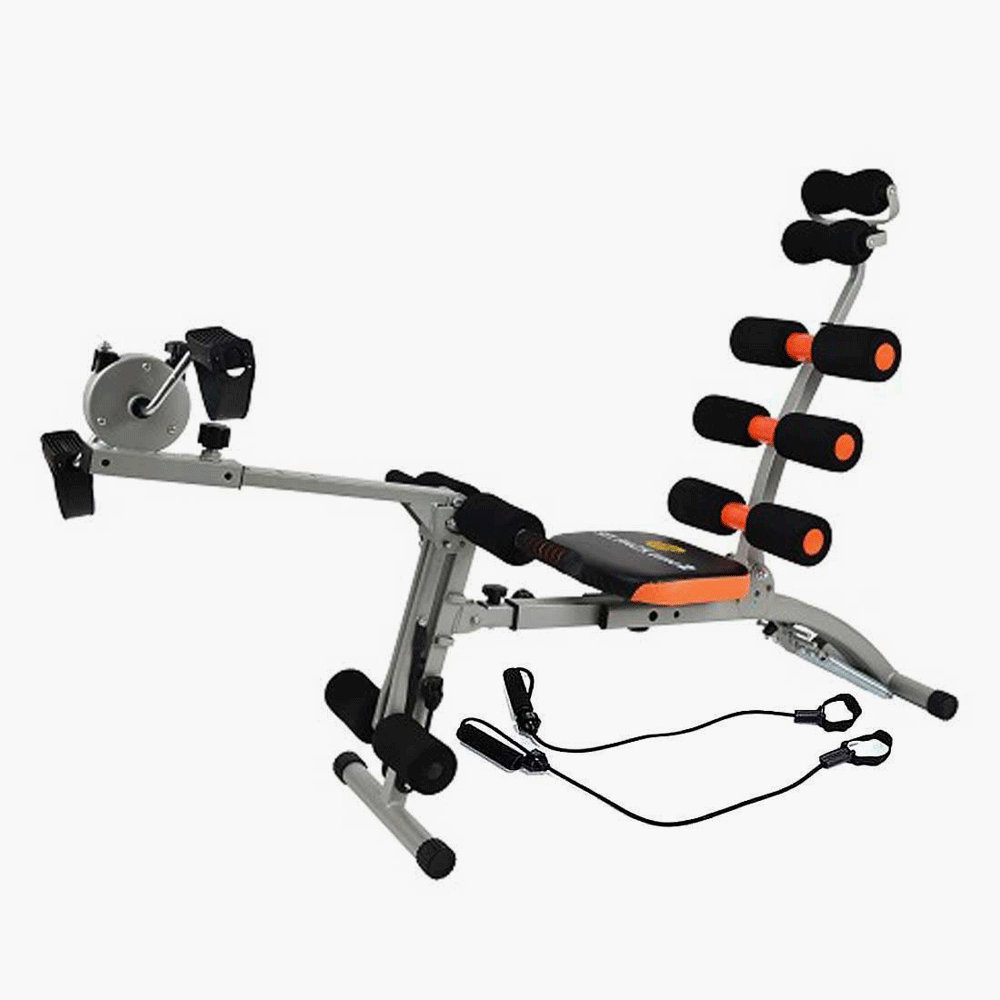 تعريف جهاز التمارين المزدوج للبطن والأرداف مع دراجة اللياقة. يستهدف هذا الجهاز متعدد الاستخدامات ستة مناطق في الجسم، ويعزز حرق الدهون وسهولة النقل.